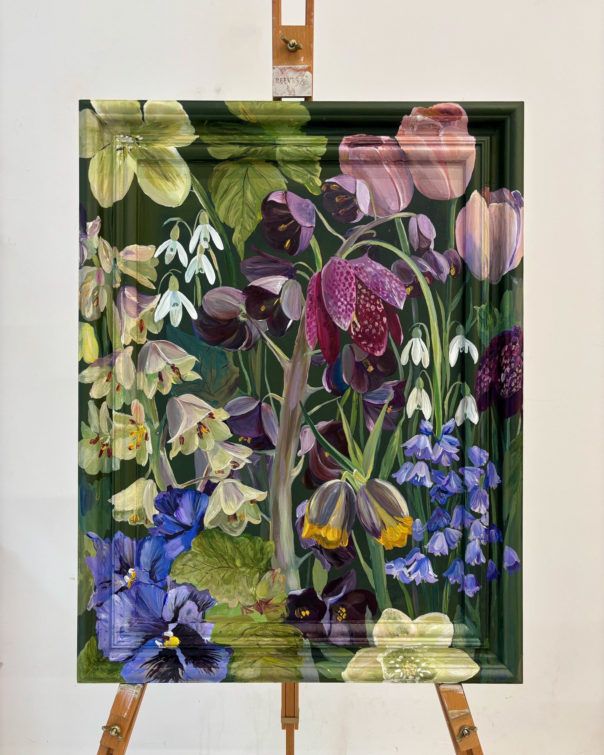 Nay's contemporary floral work beautifully merges classic botanical painting with graphic stripes and colour blocking, inspired by the vibrant colours of seasonal flora. She uses acrylics and oils to create flowers that elegantly envelop the frames. The juxtaposition of delicate, organic floral forms with the structured, geometric stripes creates a sense of tension and harmony.